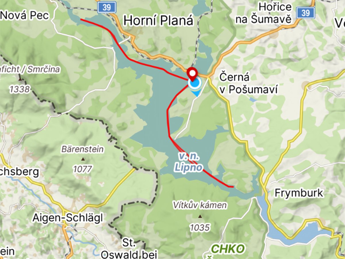 Maraton (Maraton freestyle) : Start (molo Jestřábí) - směr Lojzovy Paseky - 11 km otočka - zpět do místa startu a pokračujeme směr Nová Pec - 21 km otočka a návrat do Cíle (molo Jestřábí)